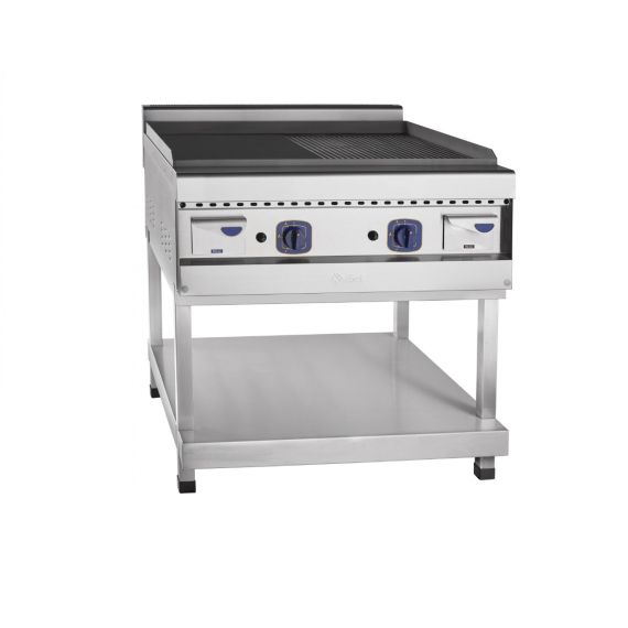 840х900х950мм, Газовый аппарат контактной обработки ГАКО-90/1П-С-00, стальная поверхность 834х703 мм, 1/2 гладкая - 1/2 рифленая, 900 серия, 840х900х950 мм, пьезорозжиг, газ-контроль, 16 кВт, на подставке с полкой, вся нерж.