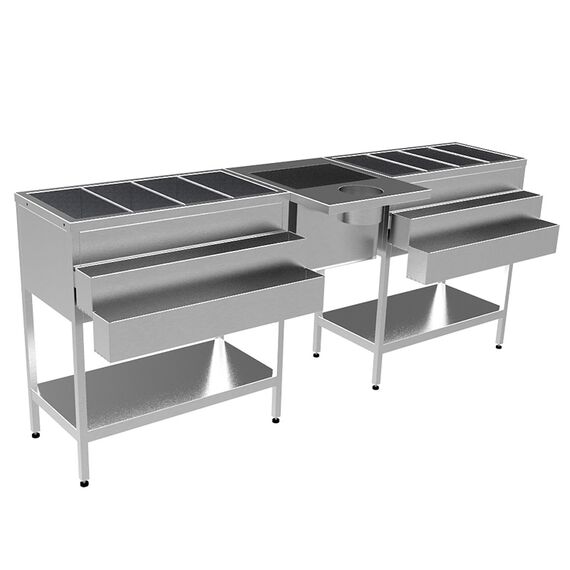 2000х600х870 Барная станция. Корпус - нерж. сталь aisi 430, 2 сварные теплоизолированные мойки 710х340х270мм (каждая разделена на 4 части съемными перегородками) и 380х280х300мм из нерж. сталь aisi 304, перфорированные вставки, 4 съемных кармана для бутылок, отверстие под смеситель Ф32мм, отверстия для сбора пищевых отходов Ф150мм, каркас нерж. труба 25х25, 2 полки, регулируемые по высоте опоры.