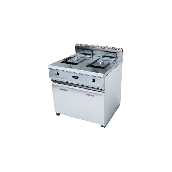 840х800х1050 мм, газовая фритюрница 800 линии на закрытом стенде с дверцами, 2 фритюрные ванны max 15+15 литров/рабочий 9+9 л 2 корзина, 2 специальные горелки, с электророзжигом, полный газконтроль, 2 газовых термостата плавно регулирующих температуру масла от +40-190С, газовая мощность 21,4 kW, настроена на метан, г.нетто 840х800х1050, 91кг, г.брутто: 920х870х1350, 114кг, полностью из н/стали
