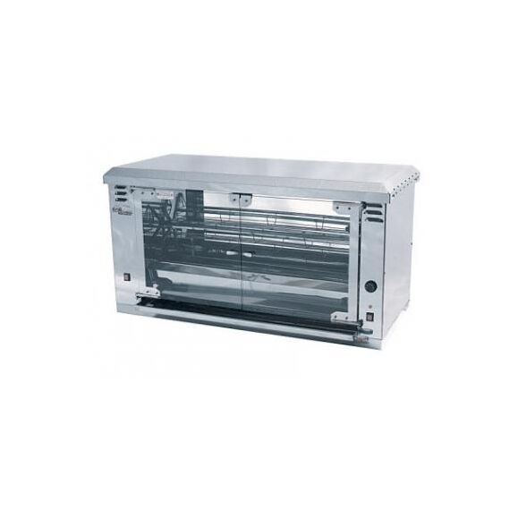 970x585x720 мм, Гриль на 20 тушек, 5 корзин для куриц или субпродуктов, 3 мощных ТЭНа, итальянский мотор-редуктор, подсветка в камере, стеклянные двери и задняя стенка гриля, регулировка температуры с помощью термостата 50-320 С, таймер на 120 минут, выполнен полностью из нержавеющей стали