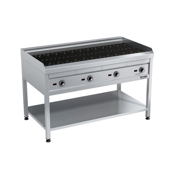 1300х700х850мм, Напольный лавовый гриль из нержавеющей стали с 4-мя зонами нагрева. Особенность этого гриля – наличие лавовых камней, долго держащих тепло и выполняющих роль раскаленных углей. Капли жира, попадая на камни, образуют лёгкий дымок, придающий мясу неповторимый вкус. Добавив на камни немного древесной стружки, вы получите продукт с тонким ароматом копчения. чугунная решетка, 4х4,5кВт, 380В, Брутто: 209кг