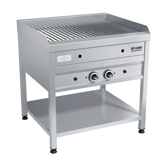 800х700х850мм, Гриль газовый напольный из нержавеющей стали. 2 мощные горелки нагревают лавовые камни. Капли жира, попадая на раскаленные камни, образуют лёгкий дымок, придающий мясу неповторимый вкус. Добавив на камни немного древесной стружки, вы получите продукт с ароматом копчения. Специальная V-образная решетка задерживает излишки жира, выделяющиеся при жарке. Лавовые камни долго держат тепло, позволяя готовить большое количество блюд. Газконтроль, запальная горелка, пьезоподжиг каждой зоны, поддон для сбора жира, работа на природном или сжиженном газе, 2х12,1кВ. Расход газа: прир (сжиж)-2,46 (1,91)м3?ч (кг/ч)