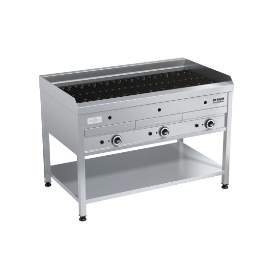 1200х700х850мм, Классический напольный газовый гриль из нержавеющей стали с 3-мя зонами нагрева. Главное достоинство – быстрый нагрев рабочей поверхности, благодаря чему время приготовления блюд существенно сокращается. Чугунная решетка долго держит тепло и образует на поверхности мяса характерный рельефный рисунок. Газконтроль, запальная горелка, пьезоподжиг, поддон для сбора жира, работа на природном или сжиженном газе, 3х12,1кВт. Расход газа: прир (сжиж)-3,68 (2,87)м3?ч (кг/ч). Высота мангала-100мм, защитный борт-50мм, рабочая зона 1190х475мм Брутто: 136кг