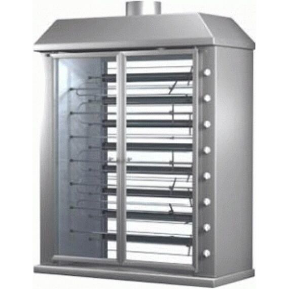 1280x570x1630мм, Рамная конструкция, цепная передача вращения шампуров, полный газ.контроль. Гриль на 75 тушек, 8 шампуров в первом ряду+7 шампуров во втором ряду, 5 тушек на шампур, выполнен полностью из нержавеющей стали, готовит курицу за 55 минут, 8 газовых кранов с ситемой газ-контроль, настроен на пропан