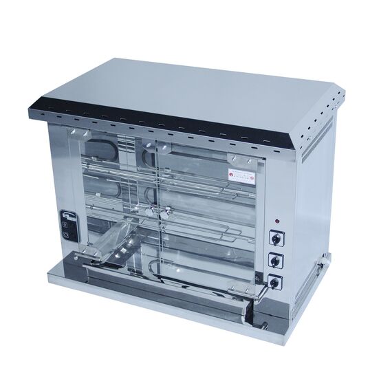 1298x507x731 мм, Гриль на 15 тушек, 3 шампура в один ряд, выполнен полностью из нержавеющей стали, готовит курицу за 55 минут