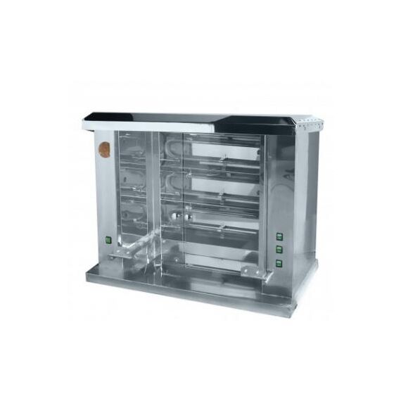 1298х582х731 мм, Гриль на 25 тушек, 3 шампура в первом ряду+2 шампура во втором ряду, выполнен полностью из нержавеющей стали, готовит курицу за 55 минут