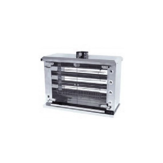 1297х585х976 мм, Рамная конструкция, цепная передача вращения шампуров, полный газ.контроль. Гриль на 35 тушек, 4 шампура в первом ряду+3 шампур во втором ряду, выполнен полностью из нержавеющей стали, готовит курицу за 55 минут, 4 газовых крана с ситемой газ-контроль, настроен на пропан