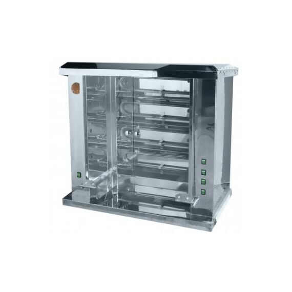 967x582x906 мм, Гриль на 28 тушек, 4 шампура в первом ряду+3 шампура во втором ряду, выполнен полностью из нержавеющей стали, готовит курицу за 55 минут