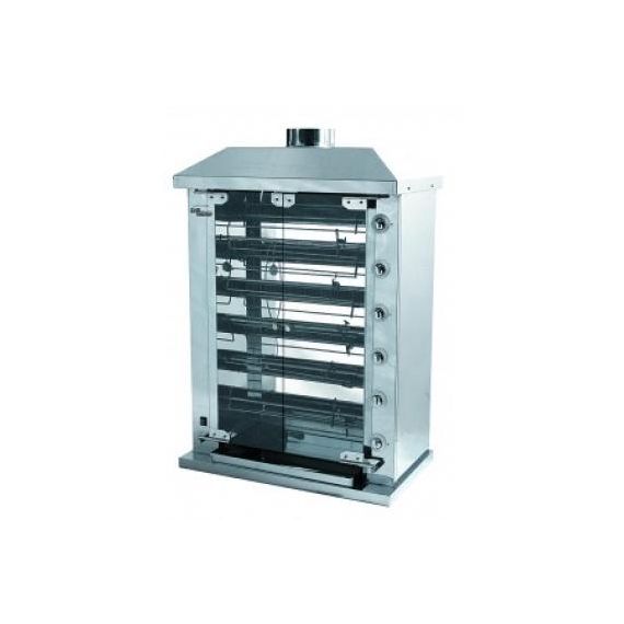 967х517х1316мм, Рамная конструкция, цепная передача вращения шампуров, полный газ.контроль. Гриль на 24 тушки, 6 шампуров в один ряд, выполнен полностью из нержавеющей стали, готовит курицу за 55 минут, 6 газовых кранов с ситемой газ-контроль, настроен на пропан