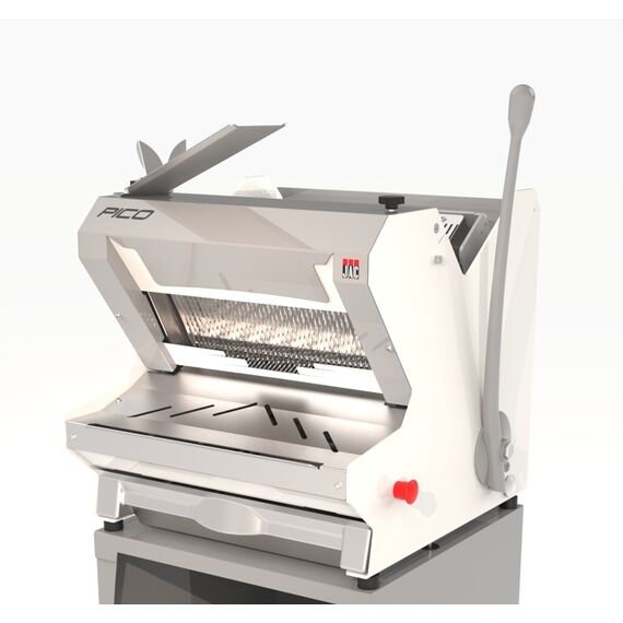 685*682*880, 0,49 кВт, 220В, нож из нержавеющей стали 13*0,5мм, максимальный размер изделия для нарезки - 440*300*180 мм, высота толкателя - 80 мм, цвет - белый RAL9010. Для нарезки ломтиками толщиной 12 мм. Производительность до 200 нарезок/час. Модель оснащена рычагом плавной тяги и выдвижным термоформованным поддоном из высокопрочного технополимера для сбора крошек объемом 7 л. Опционально рекомендуется: подставка на роликах, передняя и задняя защитные крышки. Возможное цветовое исполнение по запросу: красный, бежевый, черный, серый металлик