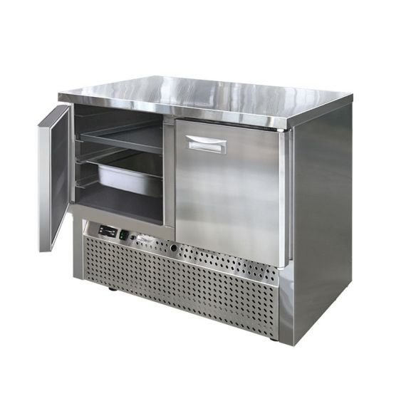 Холодильный стол выполнен из высококачественной пищевой нержавеющей стали. Используется электрический блок управления с функцией автоматической оттайки. Передняя панель агрегатного отсека имеет большую площадь перфорации, что позволяет обеспечить холодильному агрегату поступление воздуха для охлаждохлаждения.