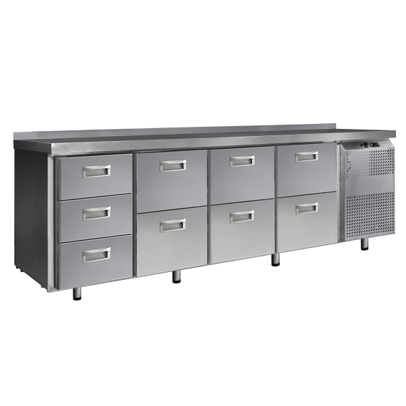 Холодильный стол выполнен из высококачественной пищевой нержавеющей стали. Столы могут производиться (выпускаться) с распашными дверями (ящиками), которые имеют надежные петли (для ящиков направляющие) с опцией доводчиков, что обеспечивает гарантированное закрытие и поддержание заданной температуры в рабочем объеме стола. Используется электрический блок управления с функцией автоматической оттайки. Передняя панель моторного отсека имеет большую площадь перфорации, что позволяет обеспечить холодильному агрегату поступление воздуха для охлаждения.