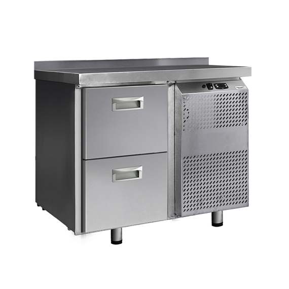 Холодильный стол выполнен из высококачественной пищевой нержавеющей стали. Столы могут производиться (выпускаться) с распашными дверями (ящиками), которые имеют надежные петли (для ящиков направляющие) с опцией доводчиков, что обеспечивает гарантированное закрытие и поддержание заданной температуры в рабочем объеме стола. Используется электрический блок управления с функцией автоматической оттайки. Передняя панель моторного отсека имеет большую площадь перфорации, что позволяет обеспечить холодильному агрегату поступление воздуха для охлаждения.