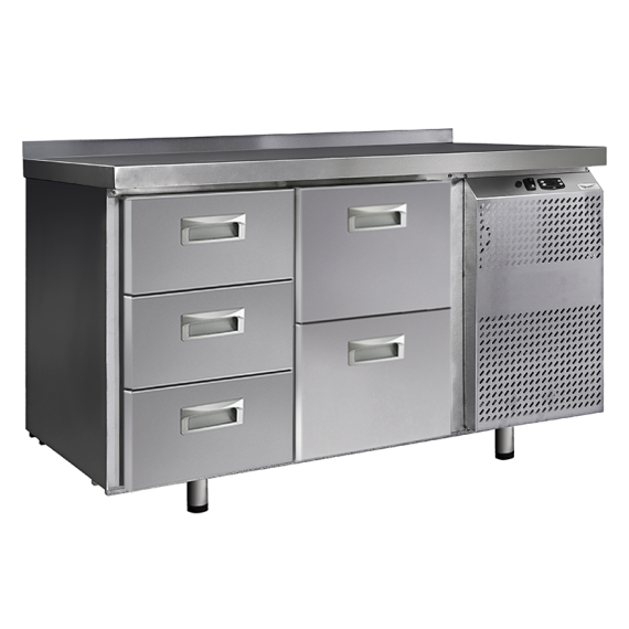 Холодильный стол выполнен из высококачественной пищевой нержавеющей стали. Столы могут производиться (выпускаться) с распашными дверями (ящиками), которые имеют надежные петли (для ящиков направляющие) с опцией доводчиков, что обеспечивает гарантированное закрытие и поддержание заданной температуры в рабочем объеме стола. Используется электрический блок управления с функцией автоматической оттайки. Передняя панель моторного отсека имеет большую площадь перфорации, что позволяет обеспечить холодильному агрегату поступление воздуха для охлаждения.