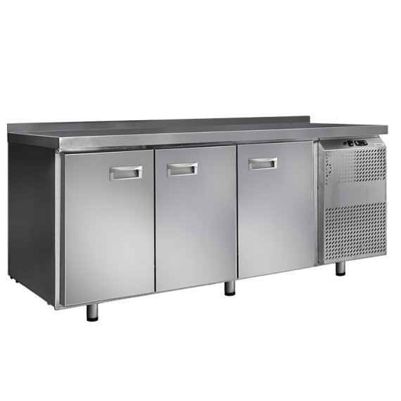 Холодильный стол выполнен из высококачественной пищевой нержавеющей стали. Столы могут производиться (выпускаться) с распашными дверями (ящиками), которые имеют надежные петли (для ящиков направляющие) с опцией доводчиков, что обеспечивает гарантированное закрытие и поддержание заданной температуры в рабочем объеме стола. Используется электрический блок управления с функцией автоматической оттайки. Передняя панель моторного отсека имеет большую площадь перфорации, что позволяет обеспечить холодильному агрегату поступление воздуха для охлаждения.
