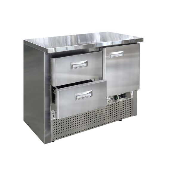 Выдвижные ящики холодильного стола снабжены доводчиками