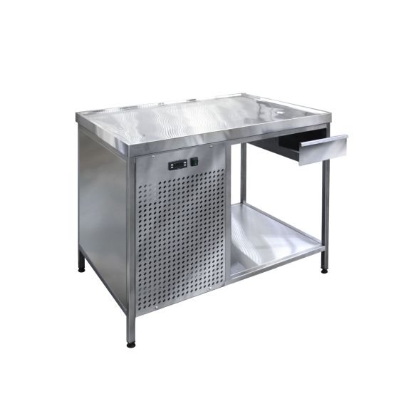 Среднетемпературный холодильный стол открытый предназначен для разделки полуфабрикатов мяса и рыбы, так же может использоваться для демонстрации и выкладки продуктов. Столешница холодильного стола, охлаждаемая, с бортиками по периметру, предотвращающими стекание жидкости на пол. В углу стола имеется дренажное отверстие для стока жидкости в лоток.Внизу стола расположена окрытая полка для хранения инвентаря. Предусмотрена возможность регулировки ножек по высоте для удобства работы.