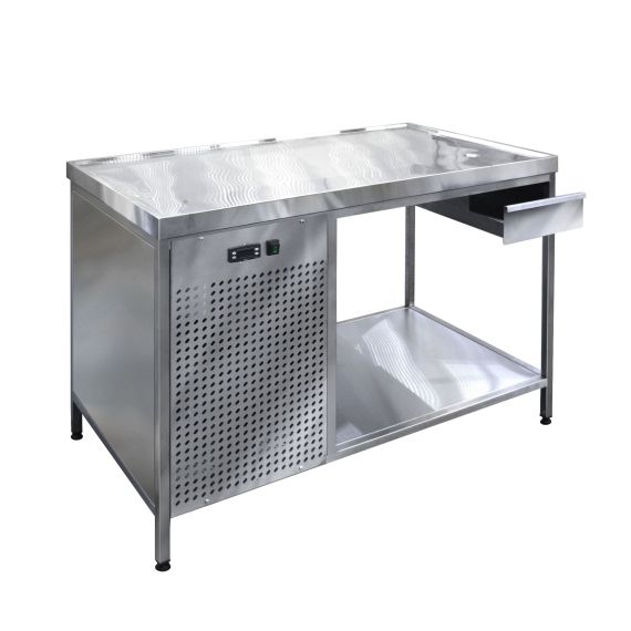 Среднетемпературный холодильный стол открытый предназначен для разделки полуфабрикатов мяса и рыбы, так же может использоваться для демонстрации и выкладки продуктов. Столешница холодильного стола, охлаждаемая, с бортиками по периметру, предотвращающими стекание жидкости на пол. В углу стола имеется дренажное отверстие для стока жидкости в лоток.Внизу стола расположена окрытая полка для хранения инвентаря. Предусмотрена возможность регулировки ножек по высоте для удобства работы.