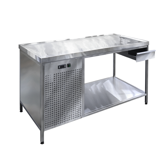 Среднетемпературный холодильный стол открытый предназначен для разделки полуфабрикатов мяса и рыбы, так же может использоваться для демонстрации и выкладки продуктов. Столешница холодильного стола, охлаждаемая, с бортиками по периметру, предотвращающими стекание жидкости на пол. В углу стола имеется дренажное отверстие для стока жидкости в лоток.Внизу стола расположена окрытая полка для хранения инвентаря. Предусмотрена возможность регулировки ножек по высоте для удобства работы.