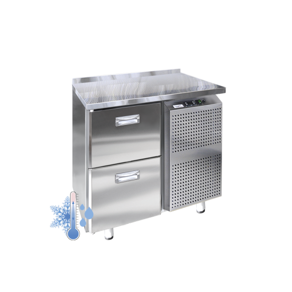 Холодильный стол выполнен из высококачественной пищевой нержавеющей стали. Используется электрический блок управления с функцией автоматической оттайки. Передняя панель моторного отсека имеет большую площадь перфорации, что позволяет обеспечить холодильному агрегату поступление воздуха для охлаждения.