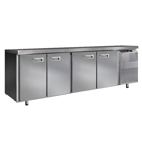 Холодильный стол выполнен из высококачественной пищевой нержавеющей стали. Используется электрический блок управления с функцией автоматической оттайки. Передняя панель моторного отсека имеет большую площадь перфорации, что позволяет обеспечить холодильному агрегату поступление воздуха для охлаждения.