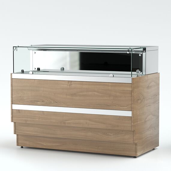 Прилавок кассовый торговой марки «Refettorio». Прилавок предназначен для установки на него оборудования для расчета с потребителями. Прилавок разделён на две части: металлическую столешницу и витрину для декора. Доступ к витрине для установки декора осуществляется со стороны ниши прилавка, с помощью горизонтального открытия панели с зеркалом. Витрина для декора имеет встроенное светодиодное освещение. Кассовые приборы можно располагать, как на столешнице, так и в нише прилавка. Для дополнительного удобства прилавок оснащён выдвижным ящиком. Фасады в стандартный комплект поставки не входят( доп. опция). Ширина прилавка, указанная в ее наименовании, не учитывает ширину фасадов. Полный габаритный размер по ширине указан в чертеже общего вида прилавка.