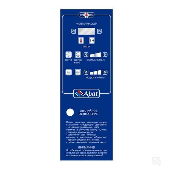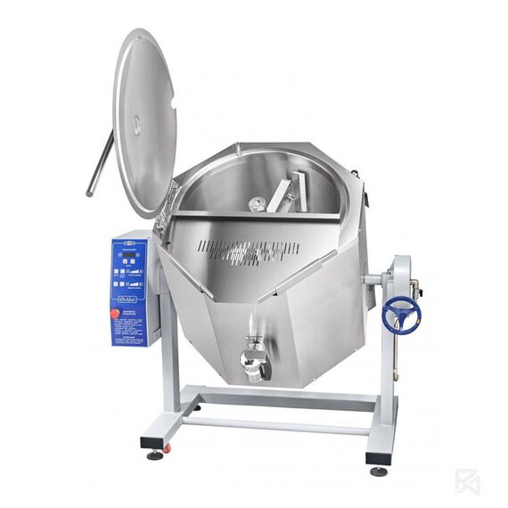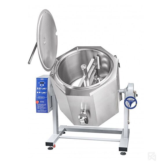 Котел пищеварочный электрический Abat КПЭМ-100-ОМР-ВК со сливным краном и функциями перемешивания и ручного опрокидывания предназначен для приготовления бульонов, соусов, десертов, вторых и третьих блюд (максимальная температура продукта +125°C). Применяется на предприятиях общественного питания как самостоятельный элемент, так и в составе технологических линий.Принцип работы основан на косвенном обогреве паром содержимого в варочном котле, который образуется при нагреве теплоносителя в рубашке. Такой процесс обогрева полностью исключает пригорание продуктов.Блюда могут приготавливаться как с перемешиванием, так и без функции миксера и при необходимости миксер легко снимается.ОСОБЕННОСТИ:цельнотянутый (без сварных швов) варочный сосуд из аустенитной нержавеющей стали марки AISI 304;по запросу возможно изготовление варочного сосуда из кислотостойкой нержавеющей стали марки AISI 316;корпус из аустенитной нержавеющей стали AISI 304;подставка на регулируемых опорах, оснащенная 4-мя передвижными колесами;объем вар