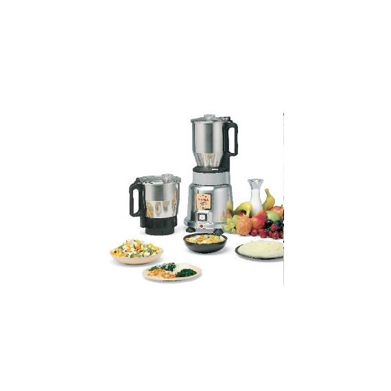220х220х450 мм, 220 V, 0,55кВт, две взамозаменяемые чаши с фукнциями блендера и куттера, 2 скорости: 17300/20000 об/мин (блендер), 700/1400 об/мин (куттер), блендер 2,2 л, куттер 2,5 л, группа из двух ножей для измельчения мяса, микропереключатель, термозащита