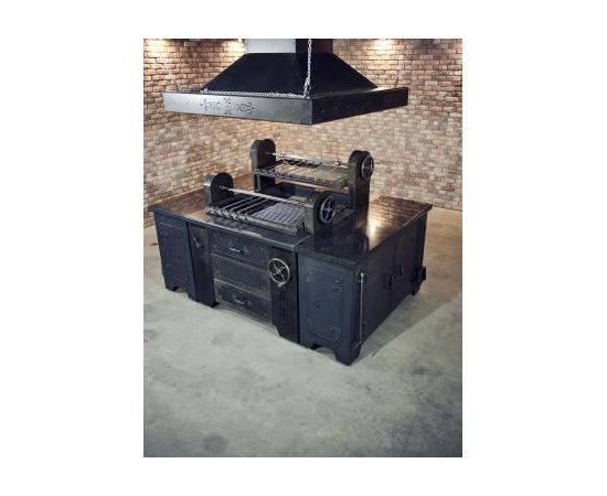 2182х1460х900мм, Винтажный стиль,выполнен полностью из высококачественной нержавеющей стали, покрыт специальной порошковой краской и лаком, 2 сетки для жарки стейков/рыбы/шашлыка 10 шампуров для шашлыка, 1 центральный шампур из нержавеющей стали для жарки барашка/попросенка/кабана/ с механическим и электрическим приводом приводом(регулировка шампура по горизонтали),1 центральный шампур из нержавеющей стали для жарки дичи с механическим и электрическим приводом приводом(регулировка шампура по горизонтали) регулируемое поддувало, 2 выдвижных отсека для золы,2 подкатных стола со столешницами из натурального гранита с нейтральными полками, кочерга и лопата, вытяжка в винтажном стиле, масса 400 кг, комплект поставки: мангал островного типа, 1 шампур для барашка/поросенка, 1 шампур для дичи, 2 сетки из н/стали для стейков/рыбы, 10 шампуров для шашлыка, натуральный гранитный камень в качестве рабочих поверхностей, кочерга и лопата для углей, подходит для открытой вернадыгабаритные разме