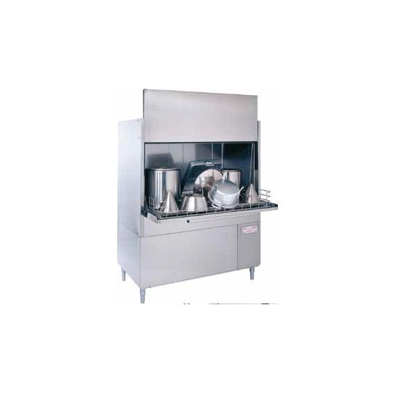 Котломоечная машина с фронтальной загрузкой, производства COMENDA (Италия) модель GE 1005E RCD, предназначена для автоматизации процесса мытья посуды и соответствия требованиям санитарных норм на предприятиях питания. Используется для мытья контейнеров, противней для выпечки, гастроемкостей GN, кастрюль, сковородок, транспортировочных термосов и другого кухонного инвентаря. Такую машину рекомендуется применять на крупных предприятиях общественного питания в моечных цехах. Размер используемых корзин - 650x700 мм. Простая электронная панель управления с цифровым дисплеем, отображающим температуры мойки и ополаскивания, данные системы диагностики неисправностей, номера циклов мойки и слива воды. Кроме того есть возможность выбора ручного или автоматического (при закрытии дверцы) режимов запуска. Котломоечная машина GE 1005E RCD имеет 4 различных цикла мытья: • подносы, противни (1-й цикл 120 секунд); • слегка загрязненные предметы (2-й цикл 280 секунд); • стандартные загрязненные предметы (3-й цикл 360 секунд)