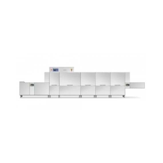 8500x985x1860/2200 мм, 87,5 Вт, 400В, производительность - 5.27-8.23 м/мин, для сплошных ящиков, инвентаря, форм для тортов, кексов, max. габарыты ящиков 640x450мм, ширина ленты- 710мм, DRF99MB - сушка с наддувом 9 кВт, HRPF30 - теплорекуператор с помпой нагрева: для подключения к холодной воде (потреб. энергии, t и влажн. воздуха в помещен. ниже, чем при доп. мощности), SAN - санобработка, DDE - дозатор моющих и ополас. средств, DX - движение СПРАВА-НАЛЕВО