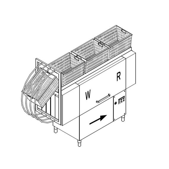 2710x805x2090/2120 H, 30кВт, 400В, можно мыть перфорированные ящики, инвентарь при размещении в корзине, SPECIAL - система загрузки корзин сверху позволяет производить работу одному оператору, производительность - 1.5-2.0 м/минуту, корзина: 510хh500мм, SX - движение СЛЕВА-НАПРАВО, XP - подключение к горячей воде, благодаря доп. элементам нагрева воды. DDE - комплект дозаторов моющего и ополаскивающих средств