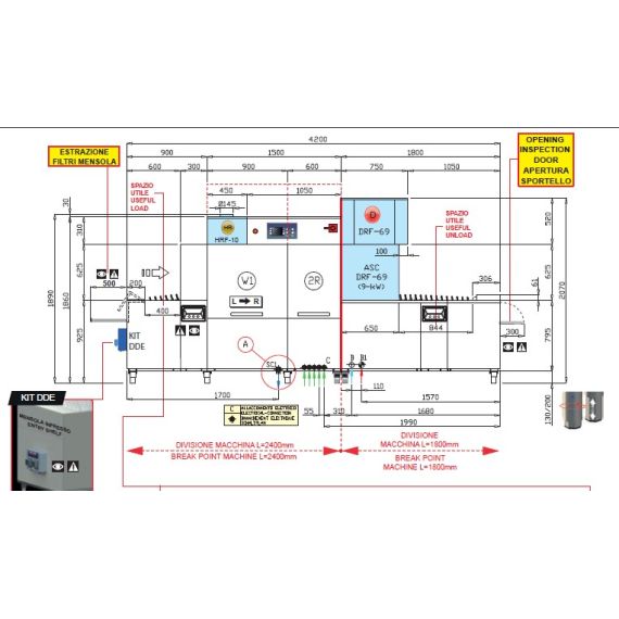 4200x983x2070мм, DDE - дозатор моющих и ополас. средств, корпус нерж AISI 304, стандартная пальчиковая лента, DRF69 - сушка-консоль (9 кВт), HRF10 - компактный теплорекуператор: для подключения к холодной воде (потреб. энергии, t и влажн. воздуха в помещен. ниже, чем при доп. мощности), ополаскивание усиленное 2+ (расход воды 190 л/час), DDE - дозаторы моющего и ополаск. средств, MI900 - исполнение с укороченным загрузочным модулем (900мм), SX - движение СЛЕВА-НАПРАВО, деление на 2 части