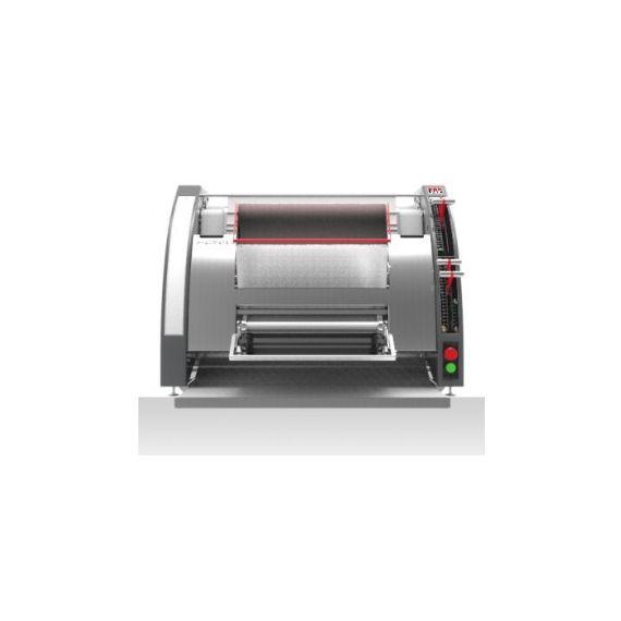 966x760х714 мм, 1,1кВт, 380В, 3 раскаточных валика из пищевого полиэтилентерефталата. Вес тестовых заготовок от 50 до 1200г. Выходная полка на скользящихнаправляющих. Сверхбыстрая смена лент бездемонтирования машины. Материал ленты - woolltop. Управление справа. Открыв переднюю дверцу, выможете раскатывать плоский хлеб.