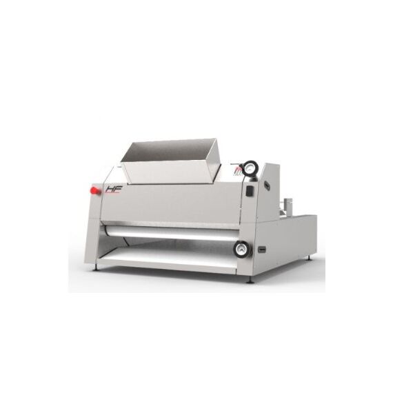 962*1144*684, 0,37кВт, 220В, 2 раскаточных валика изпищевого полиэтилентерефталата. Выходная полка на скользящих направляющих. Скребки, не требующие специального ухода. Саморегулирующаяся в соответствии с размером тестовых заготовок передаточная планка. Материал ленты - woolltop. Производительность до 1800 шт/час