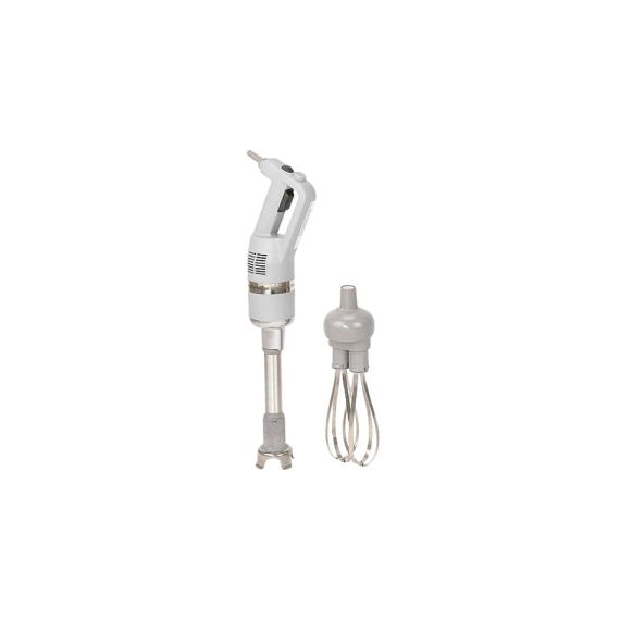 Ручной миксер, производства Robot Coupe (Франция) модель CMP250 COMBI, предназначен для приготовления кремов, небольших порций картофельного пюре, жидкого теста для блинов или оладий.Миксер состоит из помещенного в пластмассовый корпус двигателя, штанги и ножа. В верхней части корпуса расположена ручка особой формы, специально разработанной для удобного захвата и легкой работы. Выполненная в пластмассовом корпусе вентиляционная решетка обеспечивает охлаждение электродвигателя во время работы. Прибор работает в диапазоне скоростей 2300-9600 оборотов в минуту. Благодаря постепенному ускорению вращения ножа можно подобрать оптимальный режим работы, тем самым предотвращая разбрызгивание продуктов. Нож имеет литую конструкцию, обеспечивает высокую степень измельчения и качество конечных продуктов.Модель изготовлена из нержавеющей стали и ABS, имеет следующие габаритные размеры (мм): 94 (диаметр рукоятки), 610 (общая высота), 90 (диаметр штанги), 250 (высота штанги), вес составляет 3 кг. Нож и штанга выполнены из н