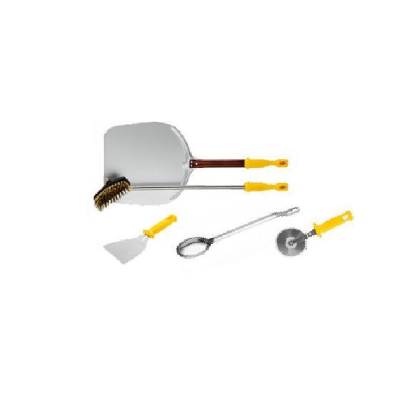 В комплекте: лопата для пиццы алюминиевая 33х33см h90см, щетка медная со скребком h90см, ложка для соуса 38см (объем 85гр), резак-ролик антиприлипающий из нержавеющей стали d9см, лопатка-скребок треугольный 12см AISI 304из нержавеющей стали с пластиковой ручкой.