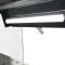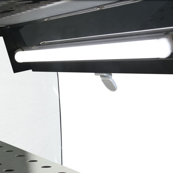 Корпус и полки выполнены из нержавеющей стали, боковые панели - из стекла с черными рамками.