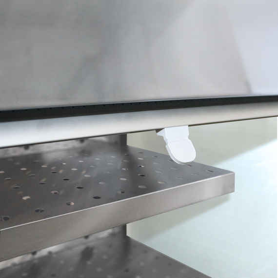 Корпус и полки выполнены из нержавеющей стали, боковые панели - из стекла с черными рамками.