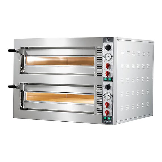 1380х910х730мм, 15,8кВт, 380В, размер камеры: 1080х720х140мм, вместимость 6+6 пицц по 35см или 2+2 по 50см, двухкамерная моноблочная печь