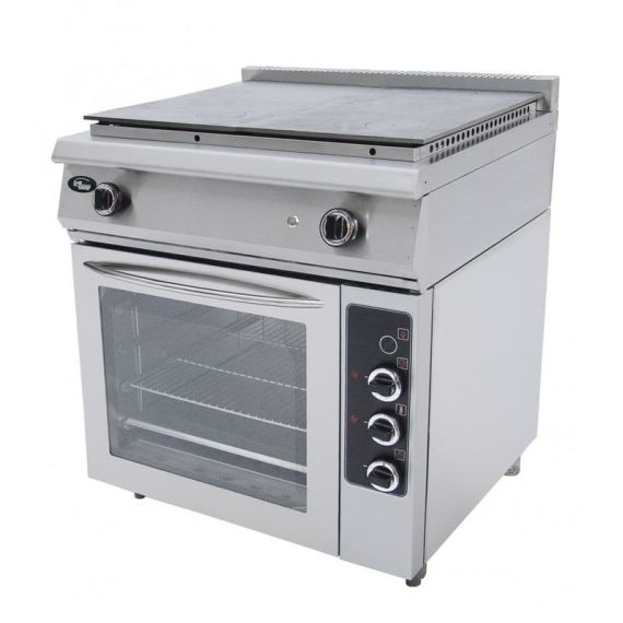 800x800x1050 мм, стальная рабочая поверхнось, 2 специальные горелки, газовая мощность плиты 23 kW, электророзжиг, газ контроль, духовка GN 2/1 из н/стали с таймером и подсветкой: сверху ТЭН 1.5 kW, снизу горелка 4.5 kW полностью из н/стали, настроена на метан (сопло на пропан в комплекте), г.нетто 800x800x1050, 220кг, г.брутто:950х950х1250, 245кг.