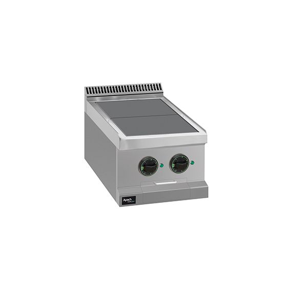 Электрическая 2-конфорочная плита с низкими конфорками 700 серии APRE-47QT предназначена для приготовления различных блюд в наплитной посуде. Столешница, вентиляционная решетка и передняя панель плиты выполнены из нержавеющей стали AISI 304, боковые и задняя панели - из нержавеющей стали AISI 430. Толщина металла 1 мм.Плита оснащена 2 чугунными конфорками с защитой от перегрева, размером 300х300 мм. Мощность каждой конфорки 2,5 кВт.Каждая конфорка имеет 6 уровней мощности нагрева и снабжена световым индикатором работы нагревательного элемента.Данная модель является настольной.Данную модель можно использовать как самостоятельно, так и в составе технологической линии.Плита работает от сети с напряжением 380В, потребляемая мощность 5 кВт. Габариты 400х700х250 мм.