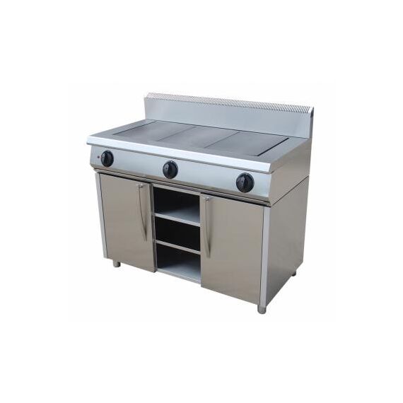 1120x600x1050, 80 кг, 3 конфорки, открытый+закрытый стенд с дверцами и полками, полностью из н/стали, разборная конструкция, 9 кВт 380 В, г.брутто 1270х750х1350, 110 кг