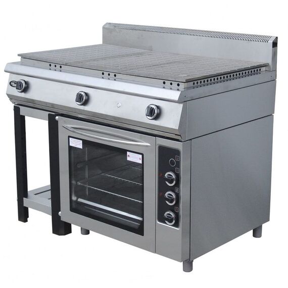 1180x800x1050 мм, стальная рабочая поверхнось, 3 специальные горелки, газовая мощность плиты 39 kW, электророзжиг, газ контроль, н/сталь, большая духовка GN 2/1, из н/стали, 90 мм между противнями, с таймером и подсветкой: сверху ТЭН 1.5 kW, снизу горелка 4.5 kW полностью из н/стали, настроена на метан (сопло на пропан в комплекте), г.нетто 1180x800x1050, 255кг, г.брутто: 1330х950х1250, 280кг.