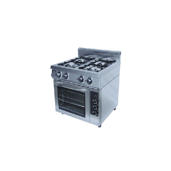 800x800x1050 мм, в дополнение к плите 50001, духовка 4хGN 2/1 из н/стали мощность духовки 4,5 кВт, с таймером 120мин, шаг между уровнями 90 мм, с подсветкой камеры духовки. Дверь духовки из закаленного стекла, исполнение плиты и духовки - полностью из н/стали г.нетто 800x800x1050, 159кг, 3 горелки по 6.5 кВт, 1 - 9 кВт, настроена на метан (сопло на пропан в комплекте), г.брутто: 950х950х1200, 184кг, общая газовая мощность 18 кВт