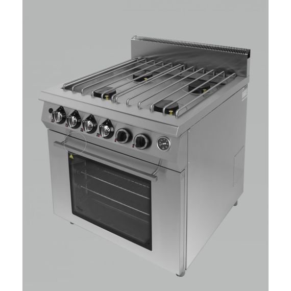 Плита газовая KAYMAN предназначена для тепловой обработки пищевых продуктов в наплитной посуде на предприятиях общественного питания, как самостоятельно, так и в составе технологических линий. Все функциональные части плиты легкодоступны с фронтальной стороны. Все корпусные элементы изготовлены из пищевой нержавеющей стали, что позволяет использовать данную установку в системе общественного питания.Изделие предназначено для эксплуатации в отапливаемом помещении, с диапазоном температур окружающего воздуха от +10°С до +50 °С, относительной влажности (без конденсации) воздуха 80% при 20°С, при условии гарантированного проветривания или наличия вытяжной вентиляции, атмосферном давлении от 84кПа до 107 кПа (от 630мм рт.ст. до 800 мм рт.ст.).900 линия, 4 профессиональных горелок класса Heavy Duty -28,5 кВт с запальной системой розжига, 4 горелки по 6 кВт, 2 горелки духовки-9 кВт(одновременное использование 1 горелки духовки), 2 газовых термостата духовки, газ-контроль всех горелок, таймер на 120 минут, подсветка д