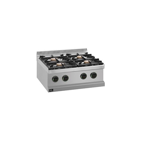 Газовая 4-конфорочная плита 700 серии APRG-77T предназначена для приготовления различных блюд в наплитной посуде.Столешница, вентиляционная решетка и передняя панель плиты выполнены из нержавеющей стали AISI 304, боковые и задняя панели - из нержавеющей стали AISI 430. Толщина металла 1 мм.Плита оснащена 4 съемными конфорками из эмалированного чугуна с латунной крышкой со стабилизатором пламени и защищенной пилотной горелкой. Мощность каждой конфорки 7 кВт. Поджиг пилотной горелки производится вручную.Предусмотрена отдельная чугунная решетка для каждой конфорки, размером 335х300 мм.Данная модель является настольной.Модель настроена на подключение к магистральному газу. Форсунки для подключения к баллонному газу в комплекте.Данную модель можно использовать как самостоятельно, так и в составе технологической линии.Общая газовая мощность плиты 28 кВт. Габариты 700х700х250 мм.