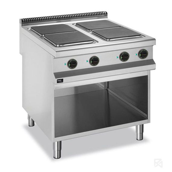 Электрическая 4-конфорочная плита 900 серии APRE-89P предназначена для приготовления различных блюд в наплитной посуде. Столешница, вентиляционная решетка и передняя панель плиты выполнены из нержавеющей стали AISI 304, боковые и задняя панели - из нержавеющей стали AISI 430. Толщина металла 1 мм.Плита оснащена 4 чугунными конфорками с защитой от перегрева, размером 300х300 мм. Мощность конфорок: 3х3 кВт+1х4 кВ.Каждая конфорка имеет 6 уровней мощности нагрева и снабжена световым индикатором работы нагревательного элемента.Данная модель укомплектована открытой подставкой с регулируемыми ножками.Данную модель можно использовать как самостоятельно, так и в составе технологической линии.Плита работает от сети с напряжением 380В, потребляемая мощность 13 кВт. Габариты 800х900х850 мм.