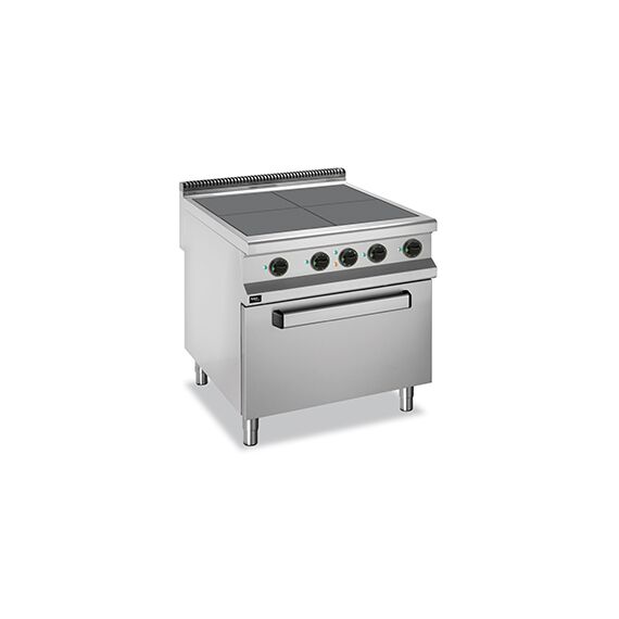 Электрическая 4-конфорочная плита 900 серии APRE-89QFE (с низкими конфорками) предназначена для приготовления различных блюд в наплитной посуде. Столешница, вентиляционная решетка и передняя панель плиты выполнены из нержавеющей стали AISI 304, боковые и задняя панели - из нержавеющей стали AISI 430. Толщина металла 1 мм.Плита оснащена 4 чугунными конфорками с защитой от перегрева, размером 300х300 мм. Мощность конфорок: 4х2,5 кВт.Каждая конфорка имеет 6 уровней мощности нагрева и снабжена световым индикатором работы нагревательного элемента.Данная модель оснащена статическим жарочным шкафом, мощностью 6 кВт. Размер жарочного шкафа 540х690х320 мм. Модель укомплектована регулируемыми ножками.Данную модель можно использовать как самостоятельно, так и в составе технологической линии.Плита работает от сети с напряжением 380В, потребляемая мощность 16 кВт. Габариты 800х900х850 мм.