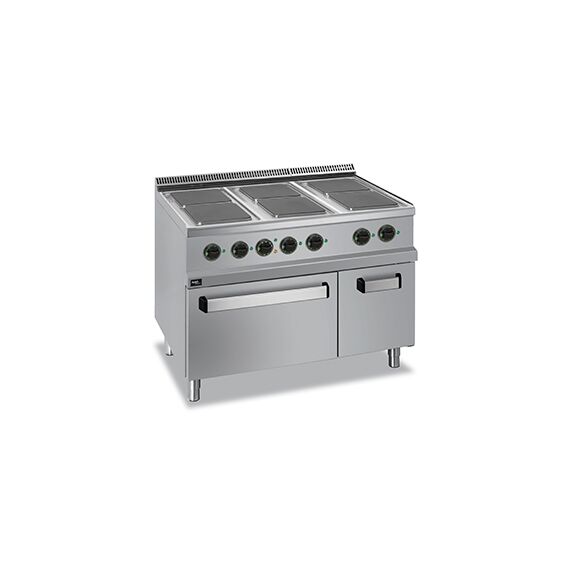 Электрическая 6-конфорочная плита 700 серии APRE-117FE предназначена для приготовления различных блюд в наплитной посуде. Столешница, вентиляционная решетка и передняя панель плиты выполнены из нержавеющей стали AISI 304, боковые и задняя панели - из нержавеющей стали AISI 430. Толщина металла 1 мм.Плита оснащена 6 чугунными конфорками с защитой от перегрева, размером 220х220 мм. Мощность каждой конфорки 2,6 кВт.Каждая конфорка имеет 6 уровней мощности нагрева и снабжена световым индикатором работы нагревательного элемента.Данная модель оснащена статическим жарочным шкафом, мощностью 5,3 кВт. Размер жарочного шкафа 560х660х310 мм. Модель укомплектована регулируемыми ножками.Данную модель можно использовать как самостоятельно, так и в составе технологической линии.Плита работает от сети с напряжением 380В, потребляемая мощность 20,9 кВт. Габариты 1100х700х850 мм.